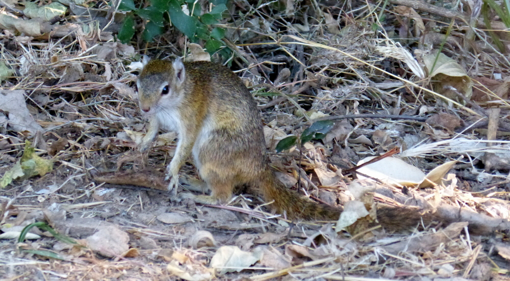 Ich gehe mit Meyam, einem bewaffneten Scout und Elizabeth und Graham auf eine Morgenwanderung. Mit den beiden habe ich mich schon angefreundet, sie sind Weltreisende und oft in Afrika. Wir sehen ein Cooksons Wildebeest, Elefanten und eine große Gruppe von Lilians Lovebirds, es ist das erste Mal, dass ich die fotogenen Erdbeerköpfchen (der deutsche Name ist nicht schön!) sehe. Diskussionsstoff liefern die Spuren des Erdferkels, nur wenige haben es je nachts gesehen, auch Meyam nicht. Wir lernen noch sämtliche Bäume mit ihren dekorativen Früchten und Samen kennen, und bereuen, dass wir wegen des Nationalparkstatus keine der Holzbananen mitnehmen dürfen, die von selbst aufspringen. Die Marula-Früchte waren leider noch nicht reif! Die Überraschung ist gelungen, als wir auf der Heimfahrt mitten im malerischen Ebenholzhain ein gedecktes Brunchbuffet und eine Buschküche vorfinden. Herrlich, jetzt genau das richtige, und während noch fleißig an den warmen Speisen gebrutzelt wird, trinken wir schon mal ein Gläschen Sekt mit Yvonne. Ich will nicht weg und liebe auch die handgefertigten Kaffeetassen mit dem Shenton-Leopardenlogo. Eine letzte Siesta auf meinem Privatdeck lässt mir Zeit für ein Fotoshooting mit einem Nilwaran und einem Eichhörnchen. Für mich geht es danach weiter zum Shenton Buschcamp Mwamba, Izzy begleitet mich hin und wir sehen auf dem Weg ein männliches Kudu, das netterweise nicht gleich wegläuft. Charlie und Matt haben dort gerade das Management übernommen, und weil sie so schön sind, gebe ich ihnen die Namen Barbie und Ken. Mwamba ist stilvoll und bushy zugleich, und hat zwei Hides direkt am Camp, eines am Wasserloch, das in der Trockenzeit bewässert wird, und ein offenes mit Sitzkissen am Termitenhügel mit Blick in die Landschaft. Mein Chalet ist eines von nur dreien und steht unter einem wilden Feigenbaum mit Eimerdusche. Es ist aus Holz und Riedmatten mit einem großen offenen Bad. Auf dem Spiegelrahmen sitzt ein Frosch, und da er sich nicht rührt, muss ich ihn neugierig anstupsen, um zu sehen, ob er echt ist. Ja, er atmet, geht aber nicht weg. Etwas beunruhigender finde ich die kleine gesprenkelte Schlange, die hinter der Verkleidung hervorlugt, aber als ich die Kamera startklar mache, ist sie blitzschnell verschwunden, so dass ich sie nicht mehr identifizieren kann. Das Chalet hat bequeme Sessel im weißen Sand vor der Tür und ist gut ausgestattet, ein mit Moskitonetz versehener Ausschnitt im Dach gibt den Blick auf den Sternenhimmel frei. Die Elefanten Tom und Jerry waren kurz zuvor noch im Camp und Charlie warnt mich vorsichtig zu sein, weil sie frech sind. Sie kreuzen aber nicht wieder auf, und wir genießen unseren Nachmittagskaffee mit Kuchen auf Stühlen im trockenen Flussbett, bevor es zum abendlichen Gamedrive mit einem australischen und einem schottischen Paar geht. Wir finden eine riesige Büffelherde mit Kälbern, Zebras, Giraffen, Pukus, Impalas, einen Spitzschwanz-Paradieswitwenvogel, und neben unzähligen Perlhühnern auch Gelbschnabelstörche und Marabus in trauter Gemeinschaft an einer Lagune, überwacht von einem Fischadler. Mit dem Spotlight gelingt noch eine Sichtung eines großen Löwen, der sich verschlafen putzt, und an einem Baum hängen zwei niedliche Flughunde, die uns mit den Ohren orten und dabei hin- und herschaukeln. Das kommunikative Abendessen mit Laternen und Kerzen am großen Tisch ist erstaunlicherweise feiner als in Kaingo, und ich schlafe tief, bequem und insektenfrei in meinem Chalet.